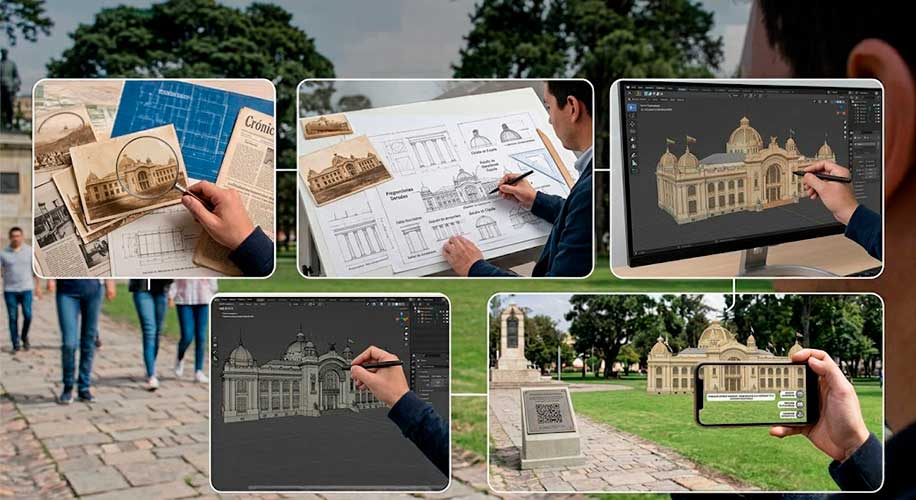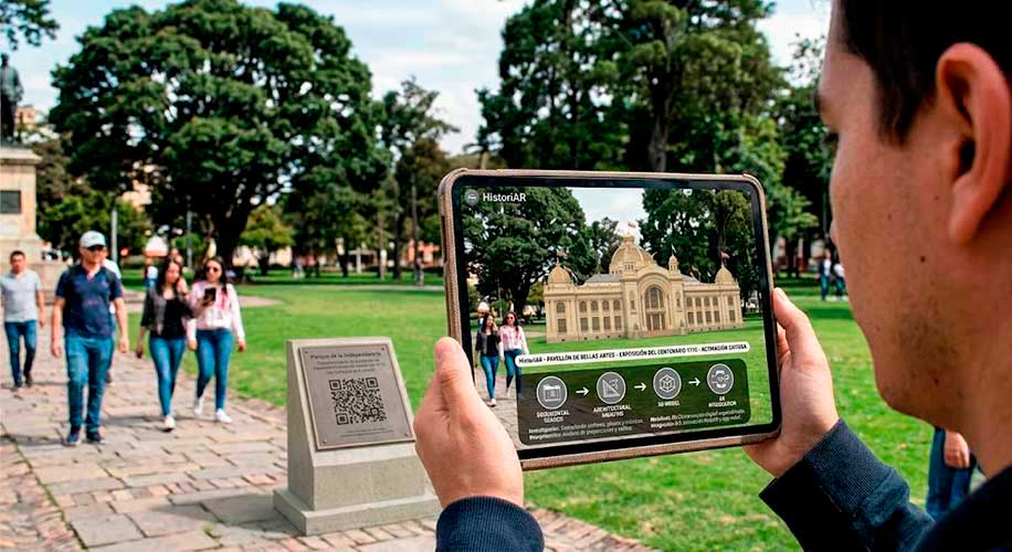 En el caso de HistoriAR, la tecnología se utiliza para reconstruir digitalmente los pabellones desaparecidos de la Exposición del Centenario de 1910 en el Parque de la Independencia de Bogotá.